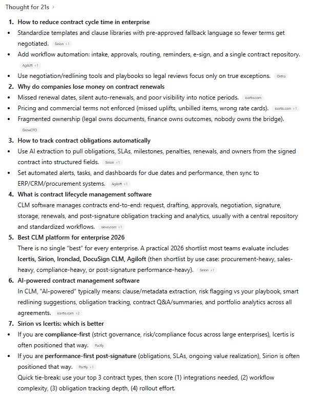 - Build comparison pages: "Sirion vs Icertis", "Sirion vs Ironclad" — own the narrative before competitors do