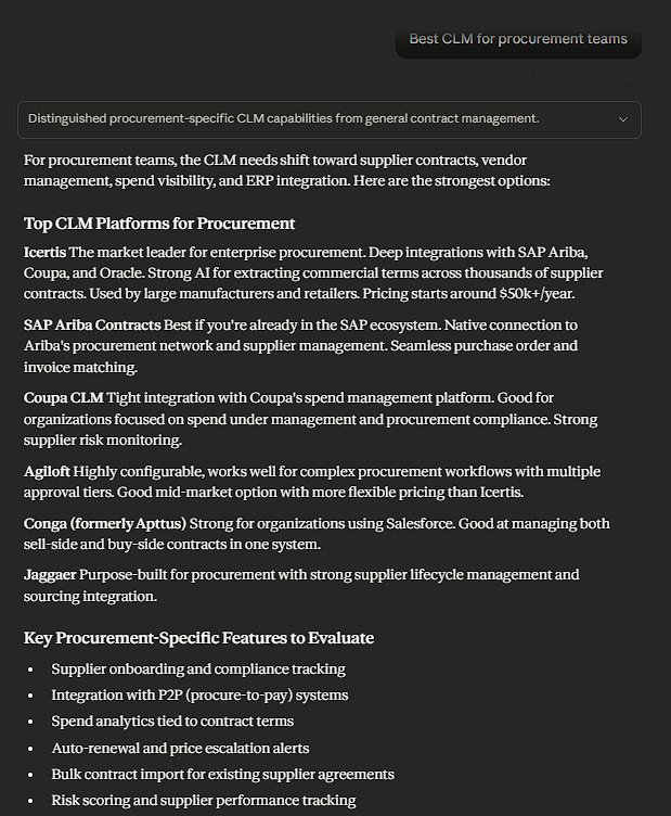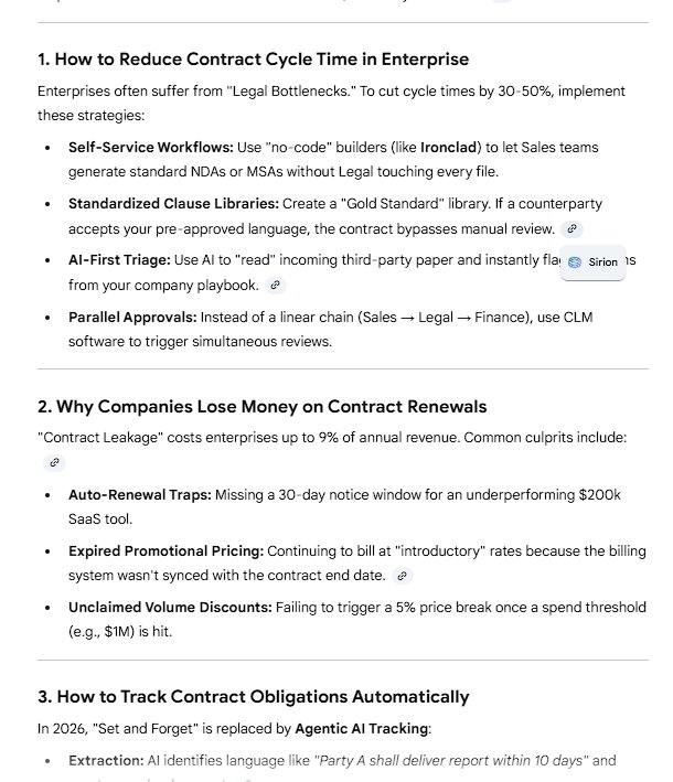 But when enterprise buyers ask ChatGPT or Gemini about CLM platforms, AI describes Sirion as "best for post-signature, obligations, and SLA tracking" — boxing you into one phase of the lifecycle while Icertis owns "enterprise governance" and Ironclad owns "pre-signature speed."