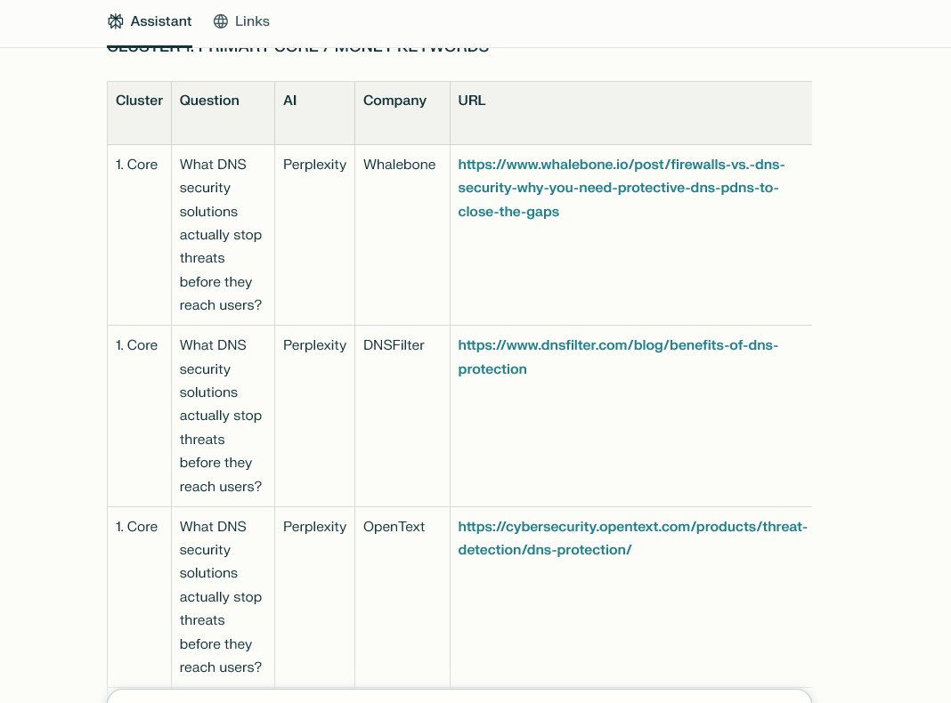 So we built a custom audit: 40 high-intent queries that real telco decision-makers ask when evaluating DNS security solutions. Tested manually across ChatGPT, Gemini, and Perplexity. Checking for Whalebone citations, competitor mentions, and source URLs.